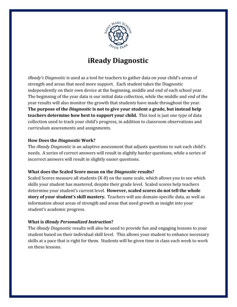 Students in Kindergarten-Grade 8 at St. Mary School are assessed academically using the i-Ready Diagnostic Test.
